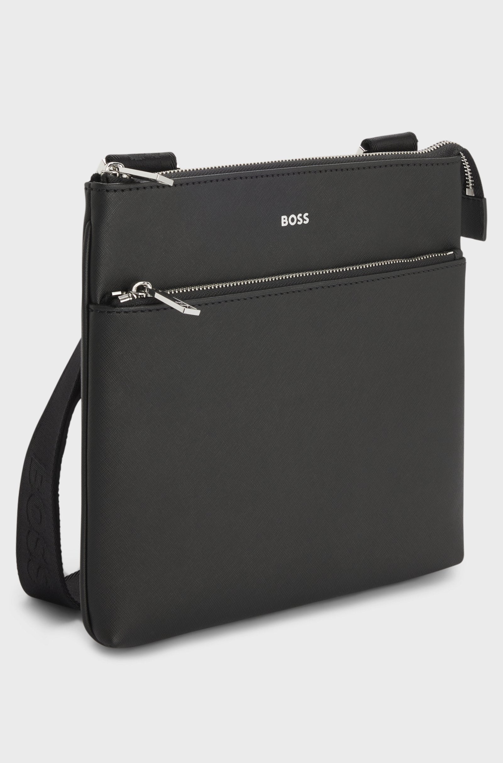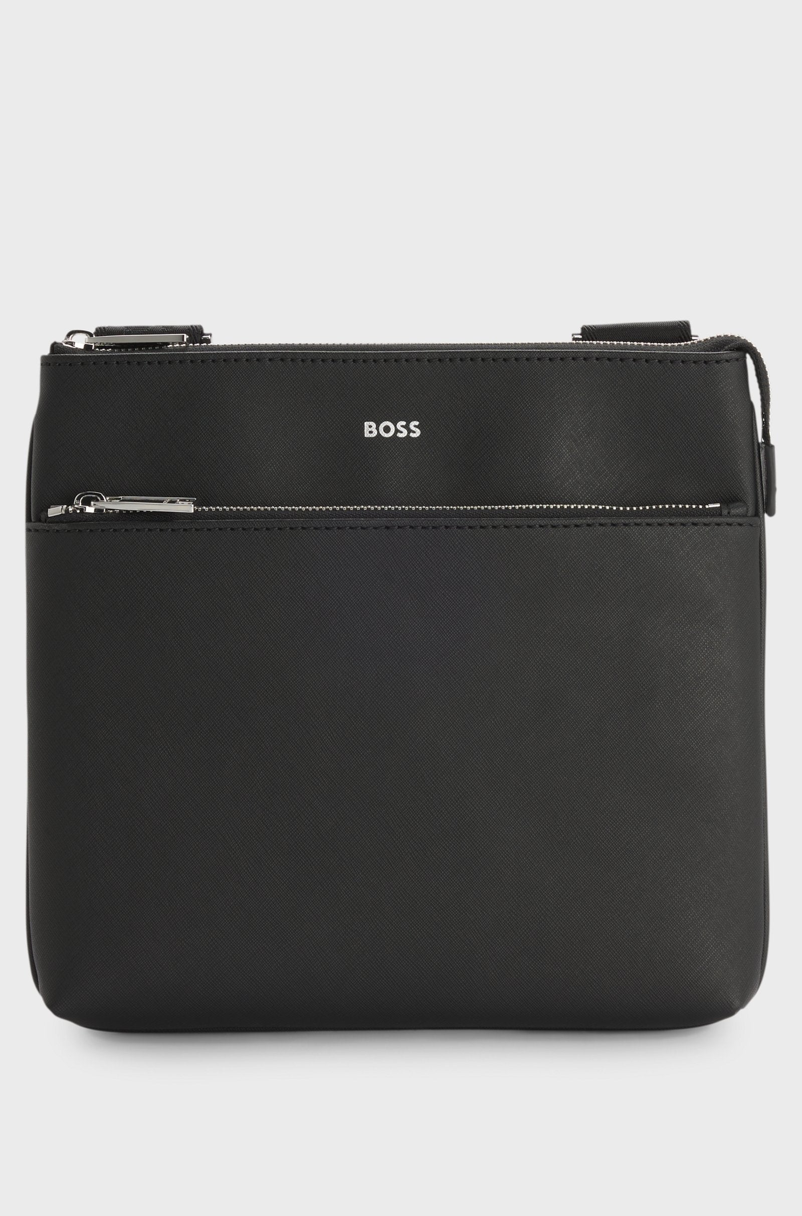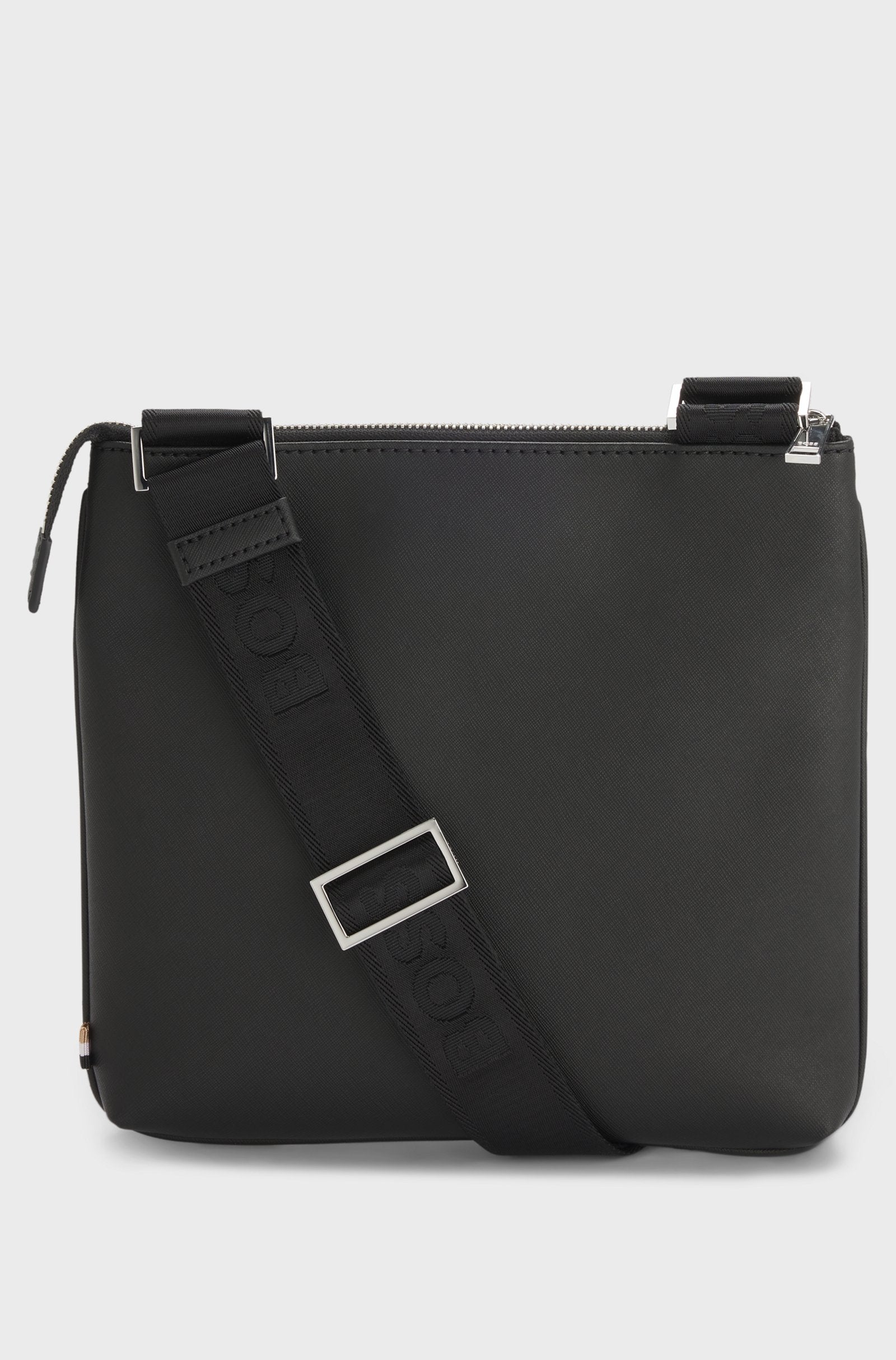 Keep essentials close by in this compact BOSS Menswear envelope bag. Crafted in elegant, structured fabric. Silver-tone hardware and coordinating foil logo. Adjustable strap. Measurements: 24 x 2.5 x 25cm