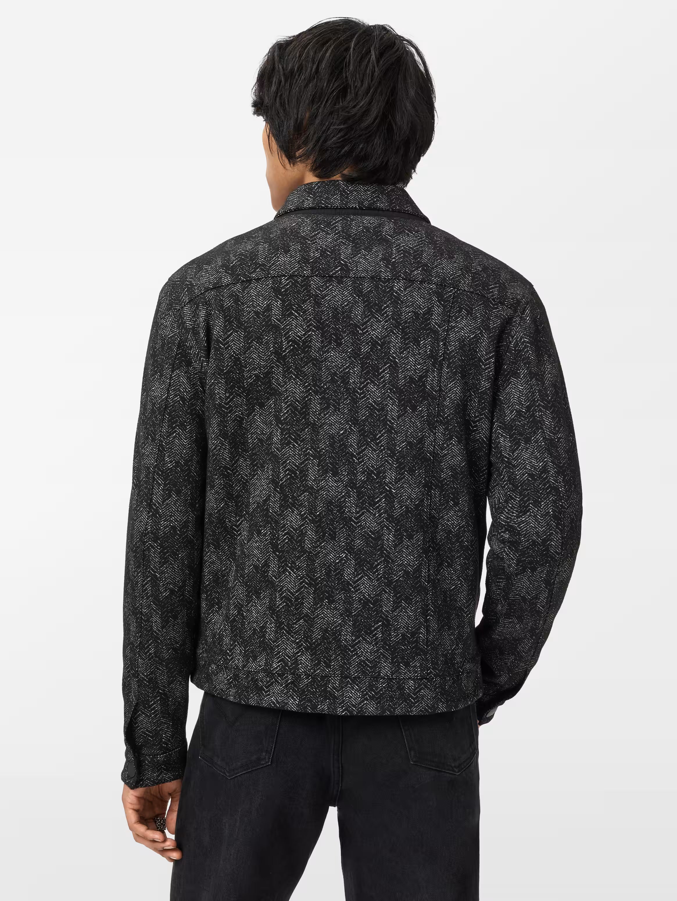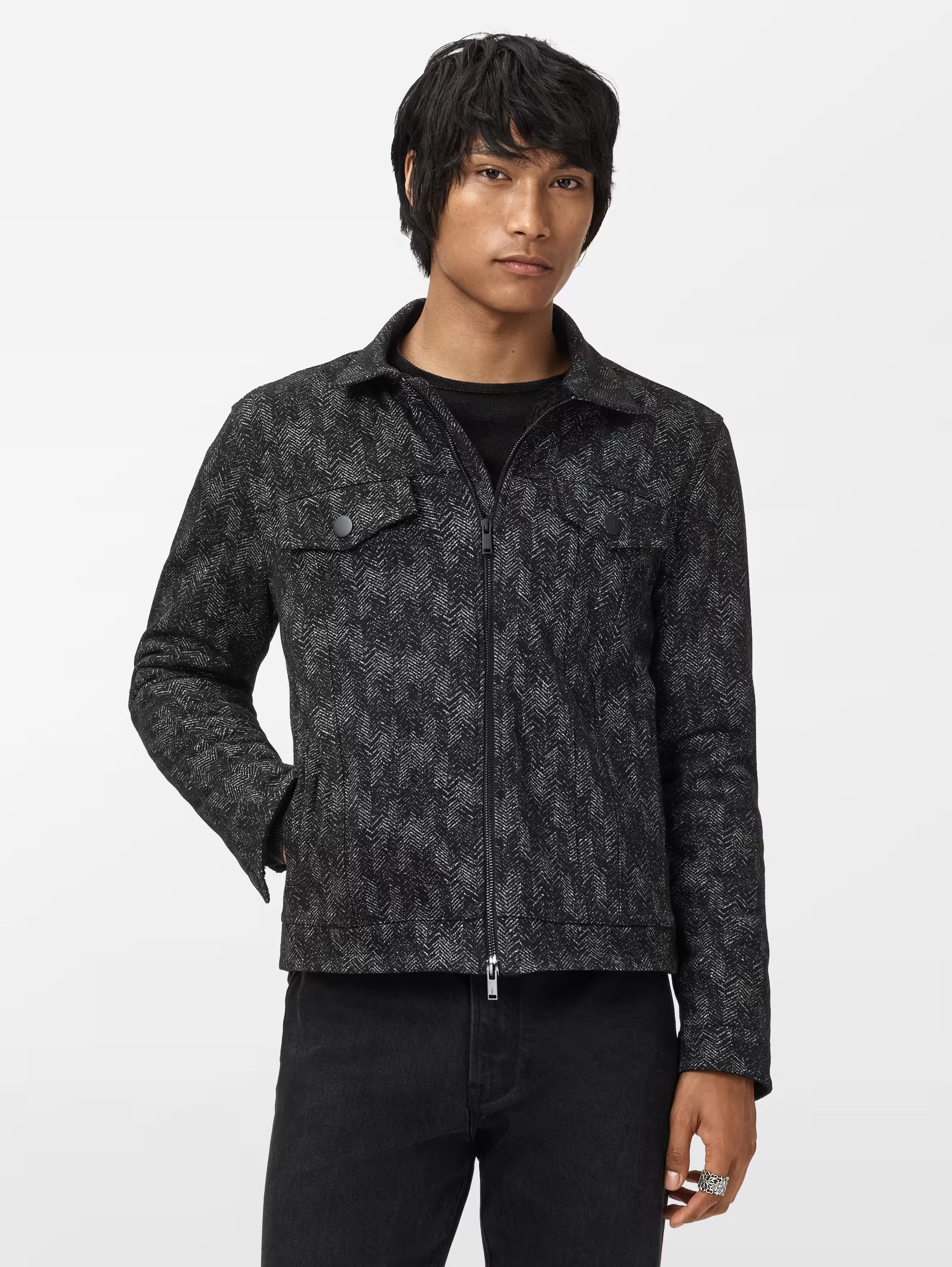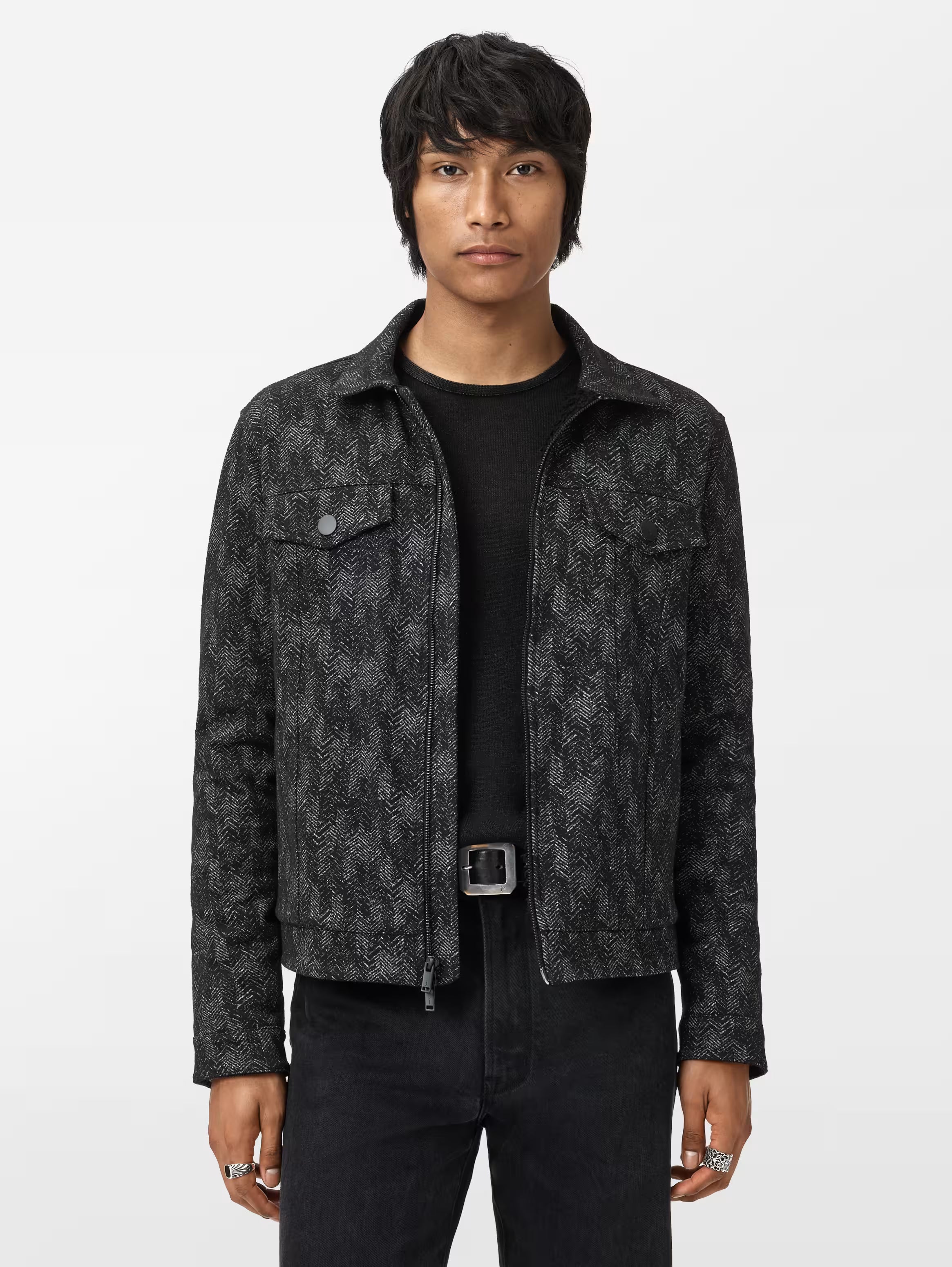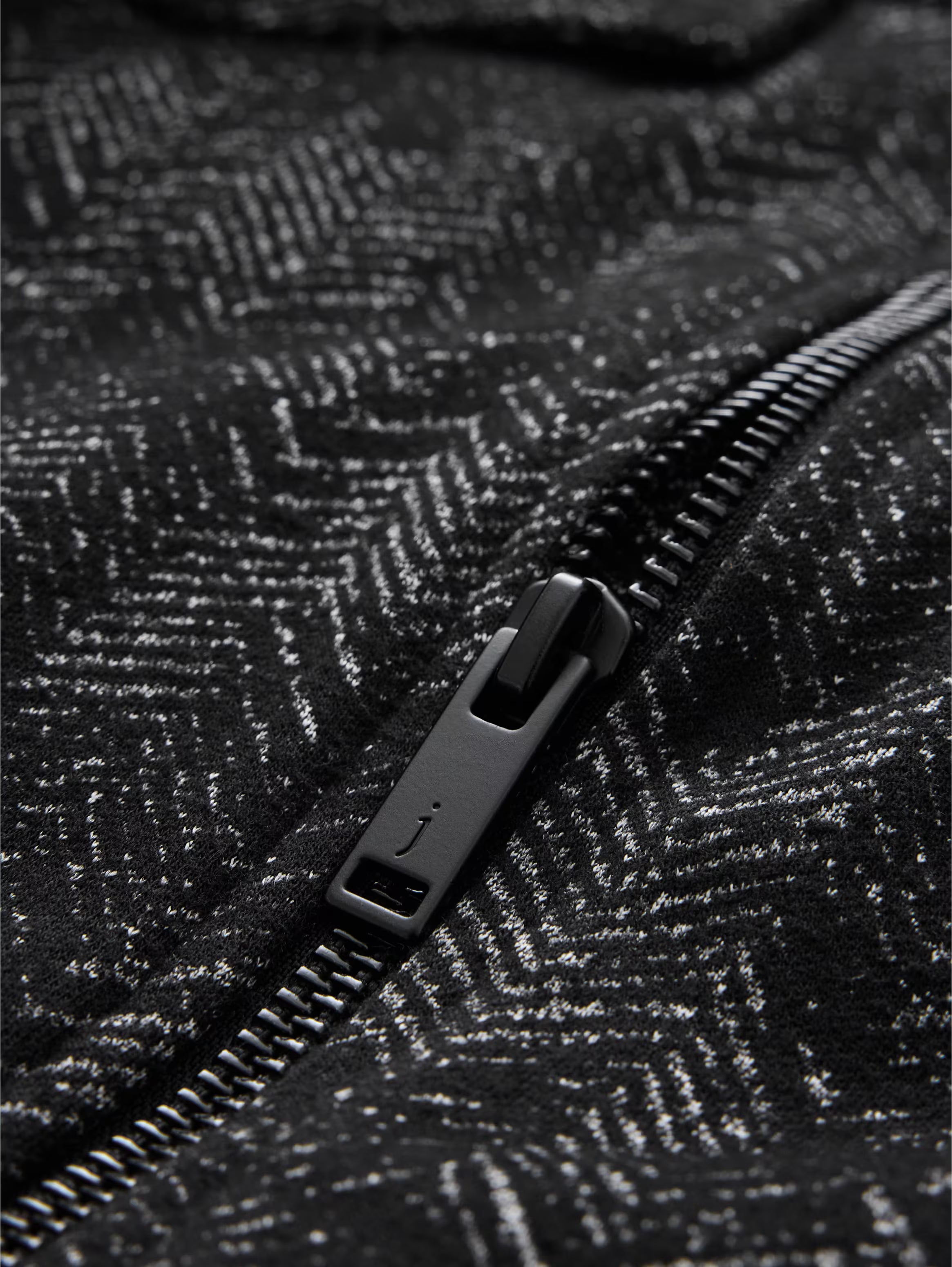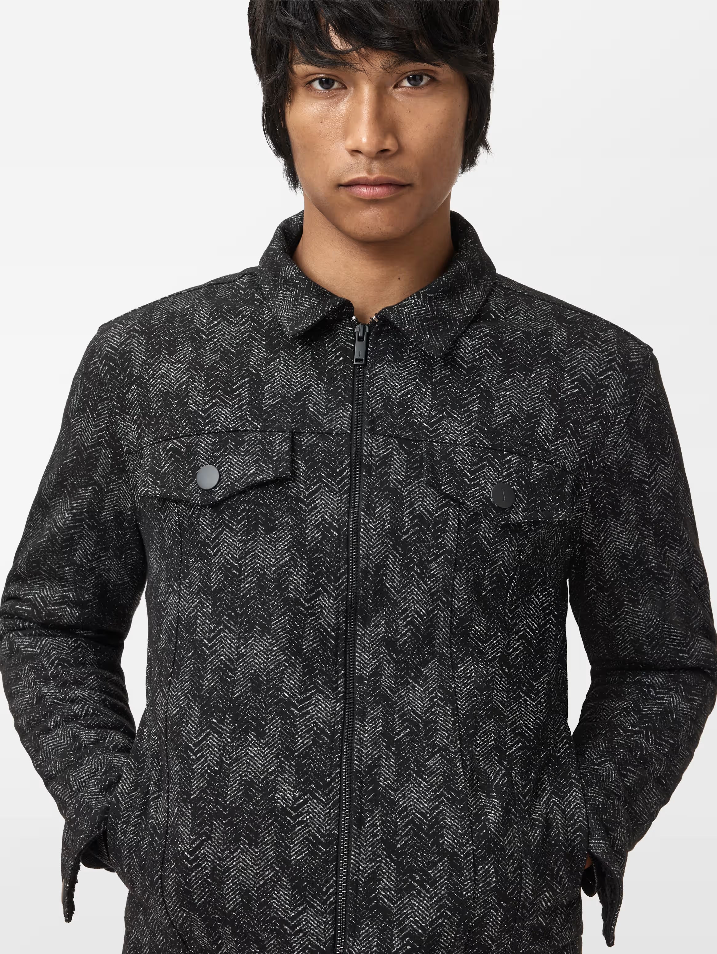 The Hallet Trucker is crafted in a jacquard fabric with a broken herringbone pattern and lined for seasonal versatility—fleece at the body and quilted nylon through the sleeves. Functional details include side welt pockets with woven linings, a two-way zipper with engraved pull, and a tonal snap at the chest. Finished with the signature JV flag label.