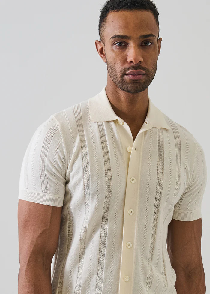 Refine your summer rotation with our Textured Knit Button-Front Polo. Crafted from a lightweight, breathable knit, this style delivers exceptional softness with a polished, tailored feel. Vertical openwork detailing adds subtle texture and dimension, while the full button-front design offers a modern interpretation of a timeless silhouette. Finished with a structured collar and ribbed hem and sleeves for a clean fit, it pairs effortlessly with tailored trousers or relaxed linen for understated warm-weather sophistication..